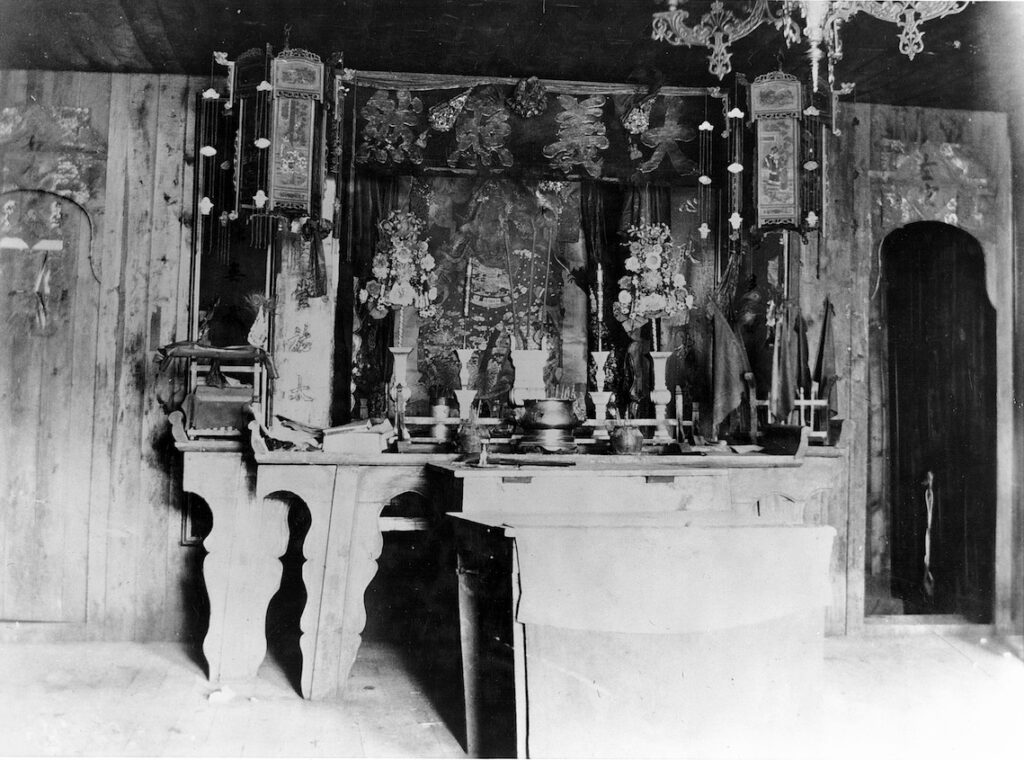 When a Chinese community in the Northern Rockies reached a few hundred residents, the members acquired the financial and material resources to raise and maintain a gong (deity temple or “joss house”) on the town’s main street or adjacent thoroughfare. Although the early log or mature timber truss-and-clapboard structure of the western American mining town was less impressive than the interlocking post, lintel, and bracket structure of southeastern China and southern Japan, it served as an important space for the deity image, sacred objects, and daily rituals within.